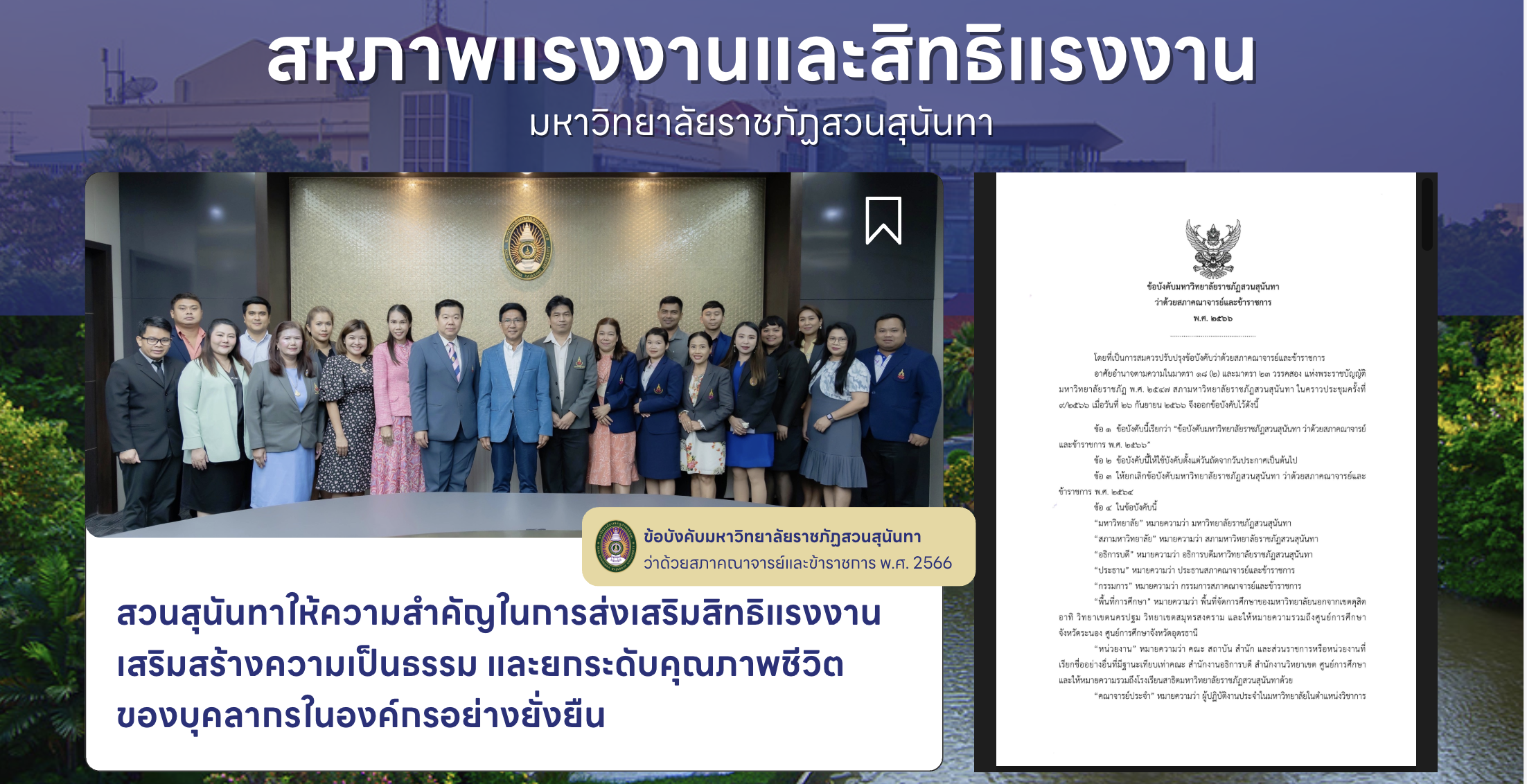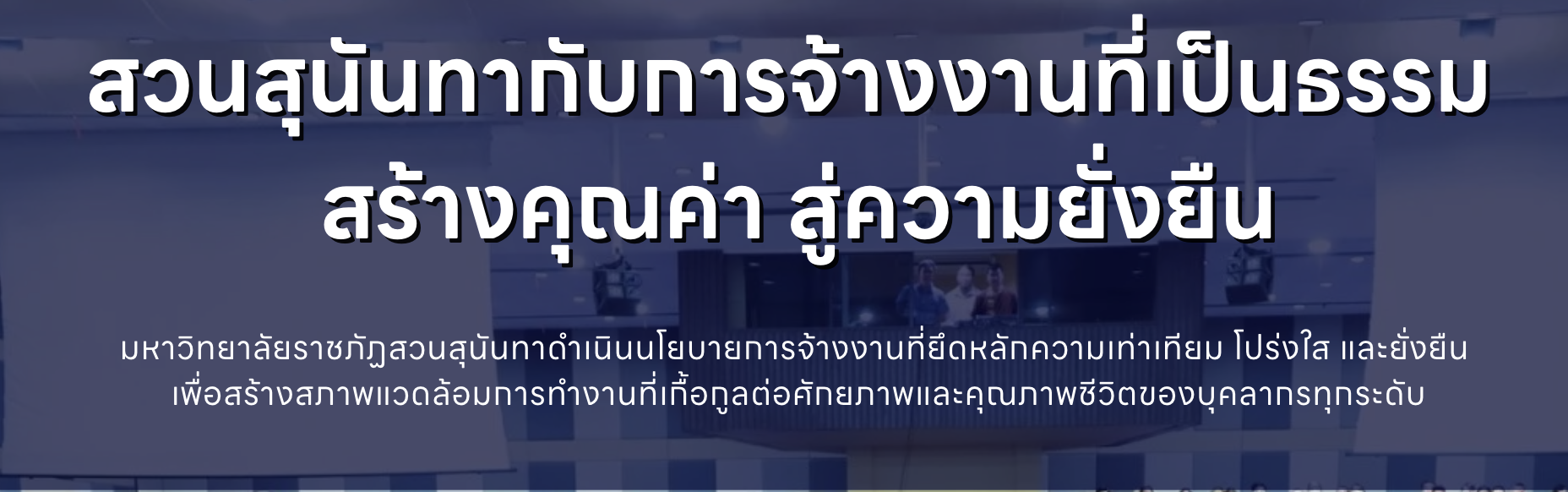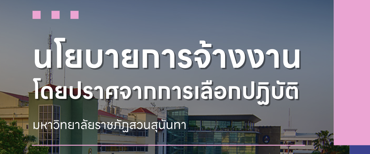 นโยบายมหาวิทยาลัยปลอดบุหรี่การส่งเสริมสุขภาพจิตแก่นักศึกษาและบุคลากรสวนสุนันทากับการจ้างงานที่เป็นธรรมสหภาพแรงงานและสิทธิแรงงานนโยบายการจ้างงานการสนับสนุนระบบสารสนเทศสำหรับการปฏิบัติงานจากระยะไกลการสนับสนุนที่อาศัยที่มีราคาย่อมเยาสำหรับพนักงานและนักศึกษาความร่วมมือกับหน่วยงานท้องถิ่นในการวางแผนและพัฒนาการบริหารจัดการพื้นที่เพื่อความยั่งยืนการพัฒนาพื้นที่ของมหาวิทยาลัยให้เกิดประโยชน์สูงสุดมาตรการการดำเนินงานที่สอดคล้องกับการผลิตและการบริโภคอย่างมีความรับผิดชอบการจัดการขยะอย่างยั่งยืน