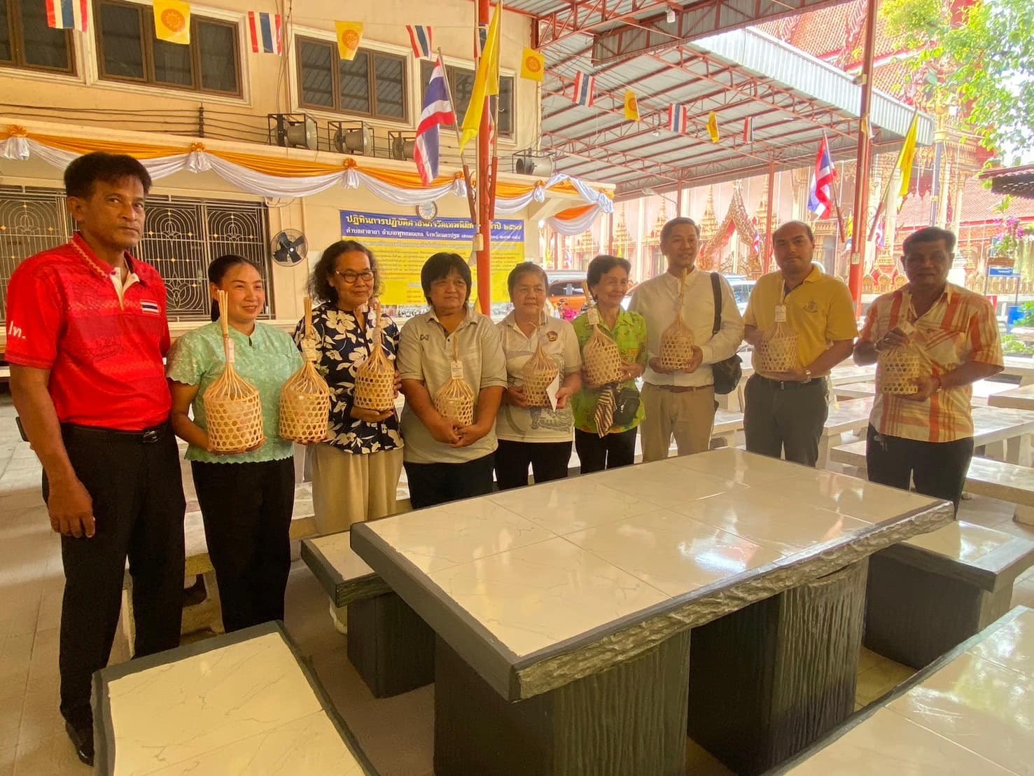 เมื่อวันศุกร์ที่ 11 ตุลาคม 2567 ผู้ช่วยศาสตราจารย์ธนิต พฤกธรา รองคณบดีฝ่ายวิจัยและบริการวิชาการ พร้อมด้วยเจ้าหน้าที่ฝ่ายวิจัยฯ ผู้แทนเทศบาล ผู้แทนพัฒนาชุมชน ผู้ใหญ่บ้าน และชุมชนหมู่ที่ 1 ตำบลคลองโยง ได้ร่วมกันถวายผลิตภัณฑ์ชุมชนที่ได้รับการพัฒนาและสนับสนุนจากโครงการพัฒนาคุณภาพชีวิตและยกระดับเศรษฐกิจฐานรากและภาคีเครือข่าย แด่พระครูนิมิตกัลยาณวัตร เจ้าอาวาสวัดเทพนิมิต ตำบลศาลายา อำเภอพุทธมณฑล จังหวัดนครปฐม โดยมีวัตถุประสงค์เพื่อส่งเสริมการพัฒนาชุมชนและเศรษฐกิจฐานราก รวมถึงเสริมสร้างความร่วมมือระหว่างภาคีเครือข่ายในการสนับสนุนผลิตภัณฑ์ท้องถิ่นที่สร้างรายได้ให้แก่ประชาชนในพื้นที่